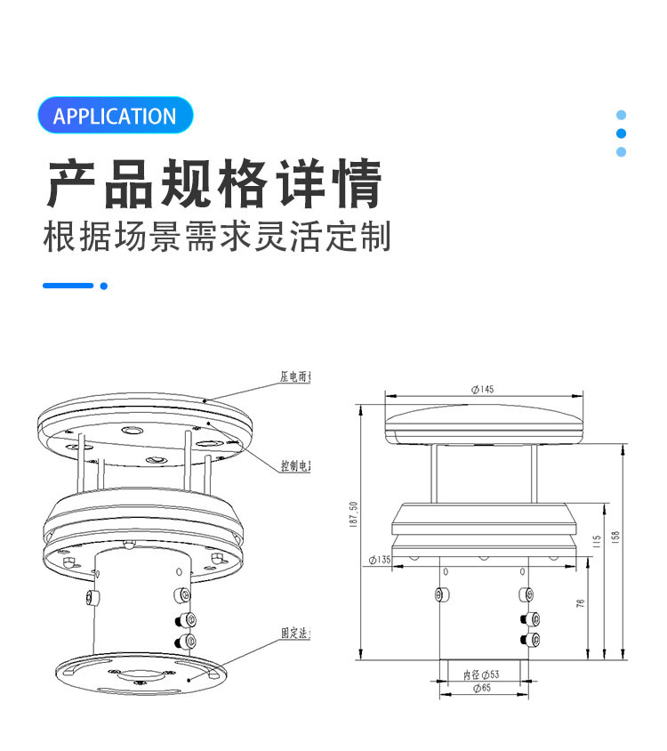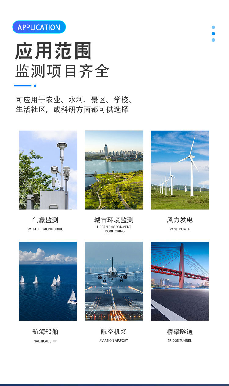 可广泛应用于城市环境监测、风力发电、气象监测、桥梁隧道、航海船舶、航空机场等领域,无需现场维护何校准。