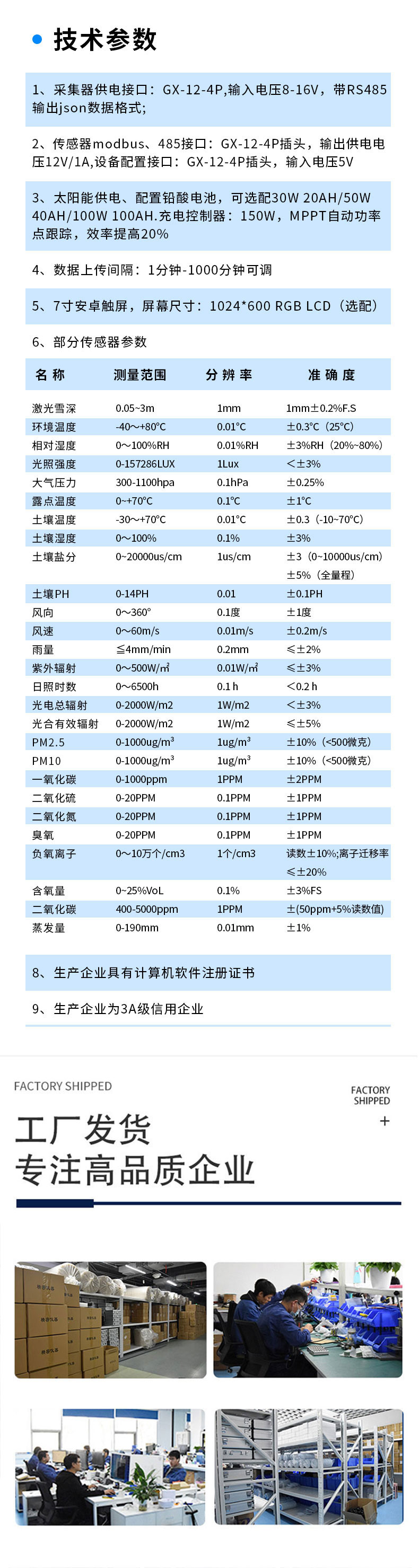 | 土壤盐分 | 0~20000us/cm | 1us/cm | ±3(0~10000us/cm)±5%(全量程) |