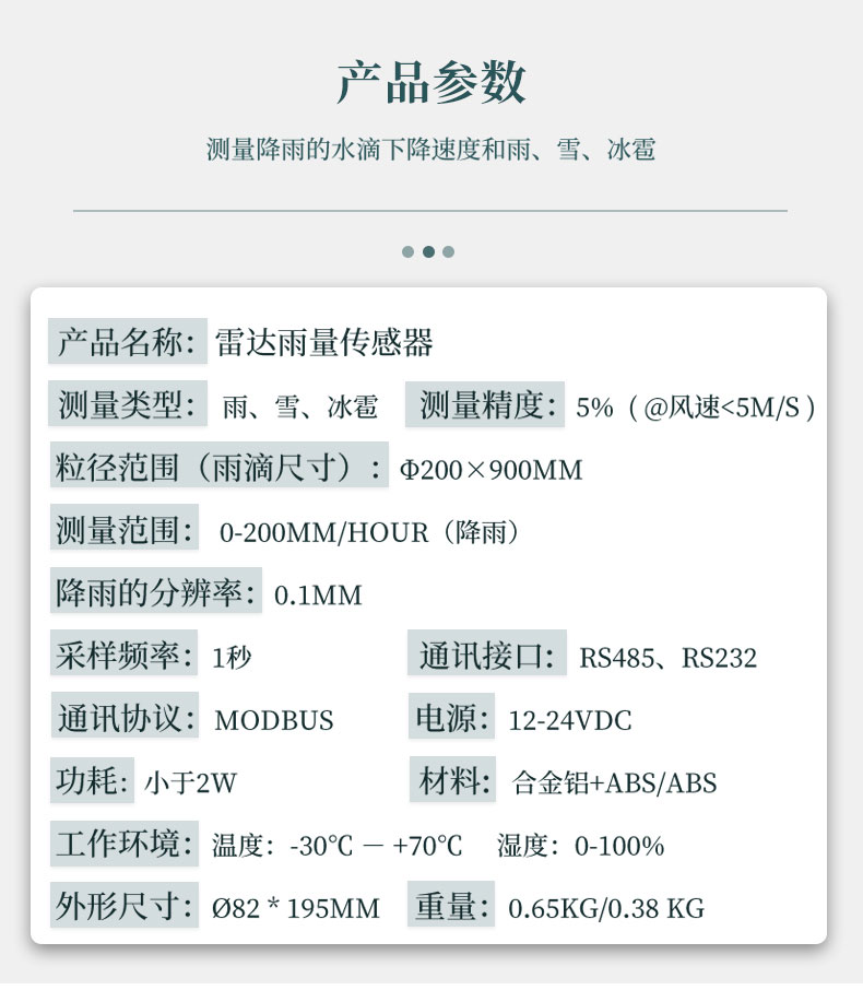 【产品简介】雷达雨量传感器产品介绍雷达雨量传感器内部采用了先进的小型平板雷达模块,使用24GHz的多普勒雷达波技术来测量降雨的水滴下降速度,并可以根据降水水滴的粒径和下降速度分辨出雨、雪和冰雹···