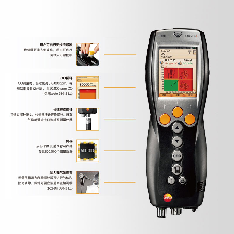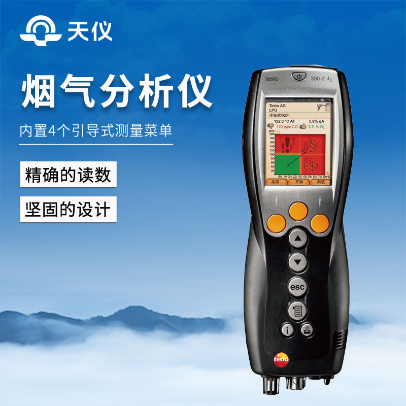 烟气分析仪操作简便,内置4个引导式测量菜单:烟气测量,抽力测量,环境CO测量以及差压测量。带背光大显示屏,适用于各种照明条件情况。
