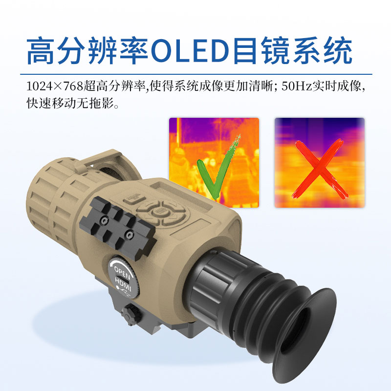 5、1024×768超高分辨率OLED目镜系统,使得系统成像更加清晰;50Hz实时成像,快速移动无拖影。专业的长焦锗镜头成像1-8倍连续变焦,探测距离更远、范围更广。白热/黑热/褐色/铁红/彩虹多种彩色可选,亮度、对比度可调节(更便于在极恶劣环境下发现目标)。
