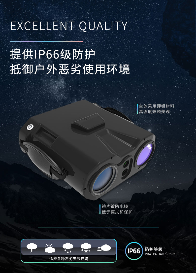 9.双胶合特制视窗:常规夜视仪窗口不具备防尘防结霜雾功能,在外界环境多样化时影响其使用;而本设备采用双胶合特制视窗,内外部防结霜雾,外部防尘隔水免雨刷窗口,适合野外应用需求,避免因雨刷尘固和雨刷片老化带来的工程维护量及维护成本的增加。
