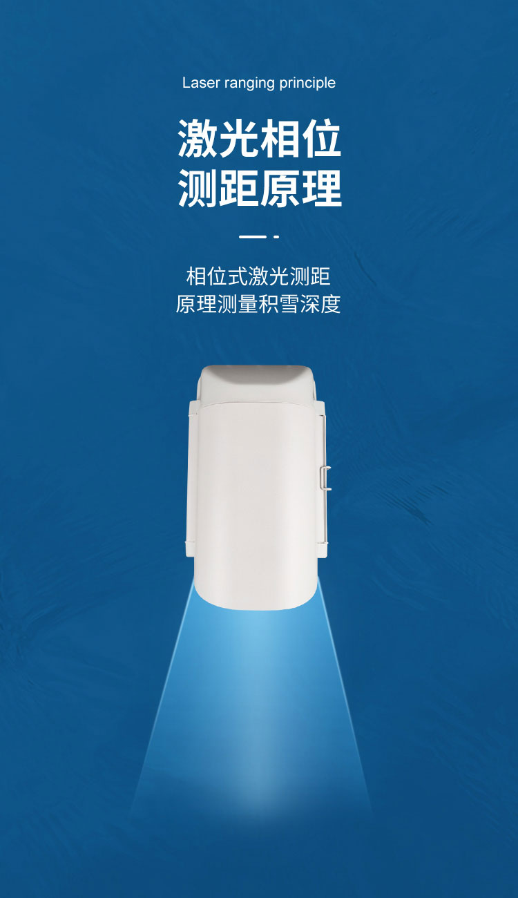 雪深传感器采用相位式激光测距仪原理测量积雪深度,相位是激光测距是用无线电波段的频率,对激光束进行幅度调制并测定调制光往返测线一次所产生的相位延迟,再根据调制光的波长,换算此相位延迟所代表的距离。即用间接方法测定出光经往返测线所需的时间,从而求解出积雪深度。