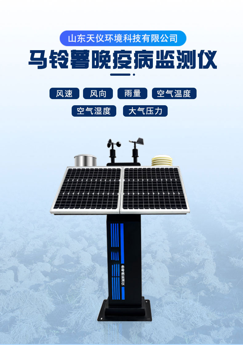 马铃薯晚疫病监测仪通过对风速、风向、雨量、空气温度、空气湿度、大气压等要素进行全天候现场监测。并通过4G无线传输至平台存储、分析。系统通过内置的晚疫病数据模型进行自动分析计算。可广泛应用于农业生产中。