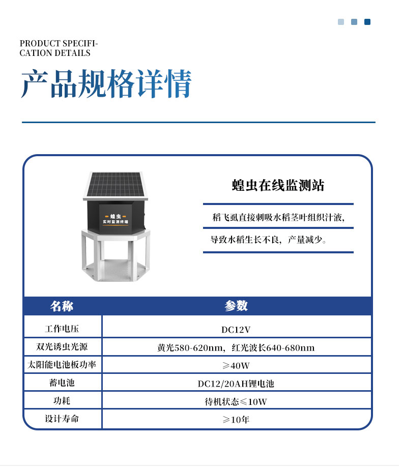 【产品简介】一、蝗虫实时监测预警站产品特点蝗虫实时监测预警站主要适用于蝗虫孳生区域,可通过光诱及性诱方式,采集与分析计算蝗虫种群密度、龄期特征等信息,支持时控功能,自动拍照,自动识别,可识别常···
