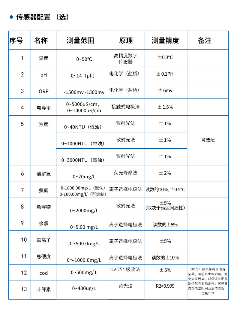 COD | 测量原理:UV 254 吸收法 双光源测量 信号方式:RS485(MODBUS-RTU) 测量范围:0~200mg/L 0~500mg/L 分辨率 :0.1mg/L 测量精度:± 5% ±0.3℃ 线缆长度:标配5米 测量环境:温度0~50℃(不结冰) ,<0.2Mpa 防水等级:IP68 安装方式:浸入式安装,NPT3/4螺纹自清洁功能:带有自动清洁器,可防止生物附着,避免光窗污染,以保证长期监测依然具有稳定性;可设置自动清洁时间及清洁次数,功耗0.7W |